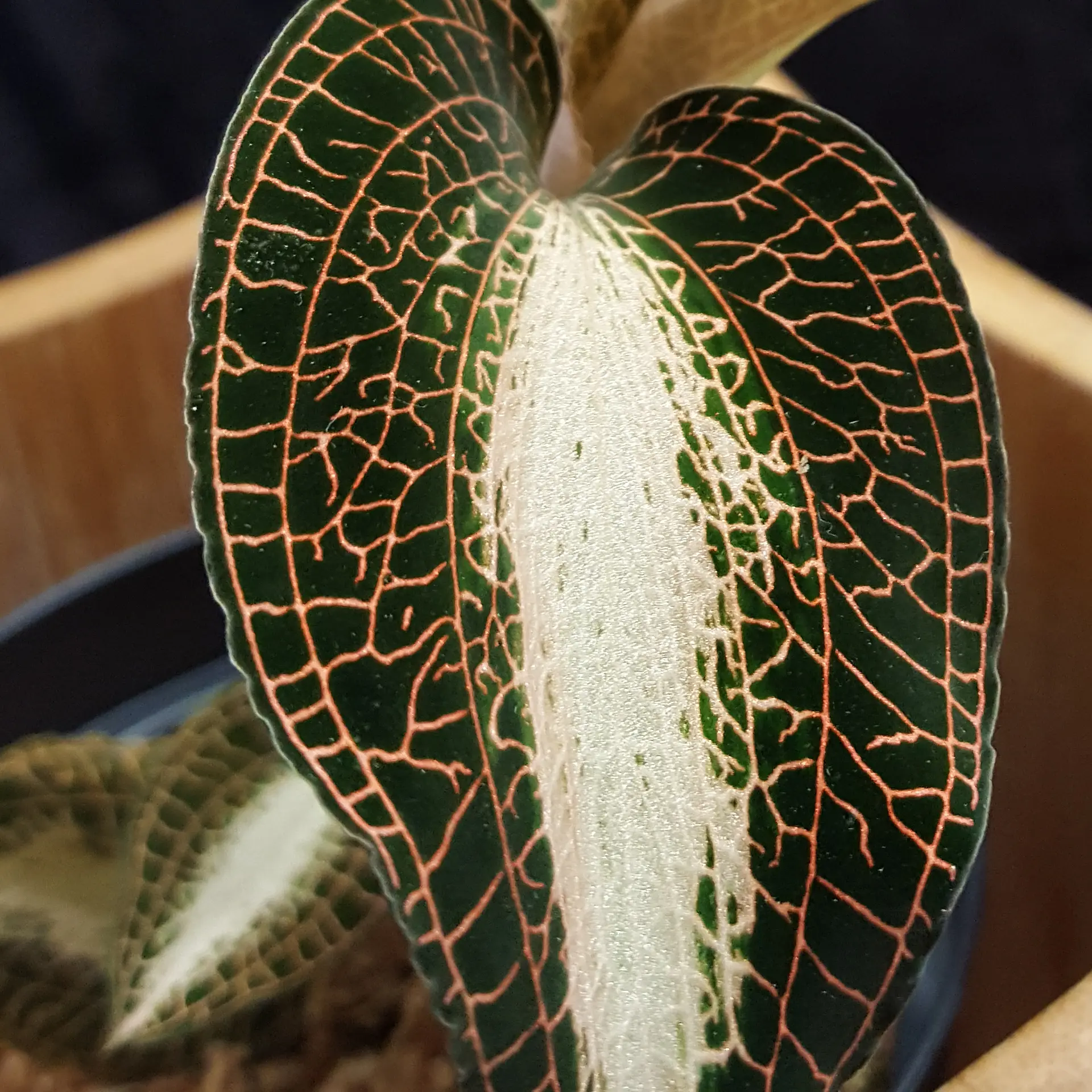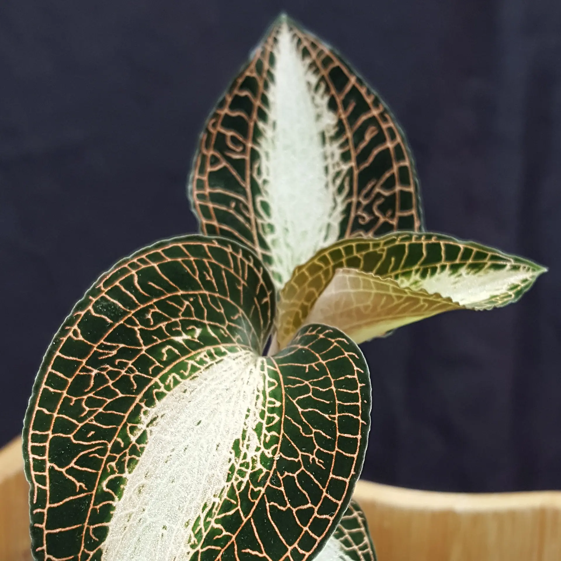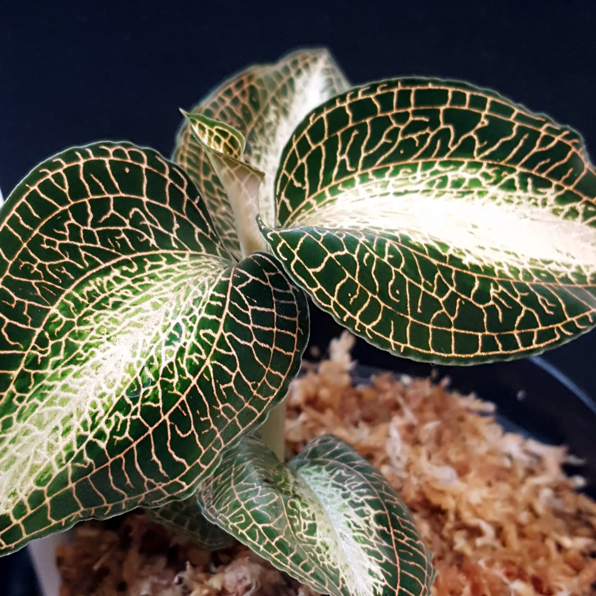 The leaves of the jewel orchid Anoectochilus roxburghii ‘Dreamcatcher’ (Wall.) Lindl. 1832 are truly a captured dream: a strongly spreading central vein is interwoven with a network of golden yellow veins ... Take the time to take a closer look at these leaves in the sunlight ... You will be enchanted. This Southeast Asian medicinal plant is certainly one of my favourite jewelled orchids. It thrives in a temperate environment and does not like direct sunlight. Overly moist substrate is also detrimental, but the Sphagnum moss should never be allowed to dry out completely. The pictures shown are examples, the plant you purchase is similar to the pictures.