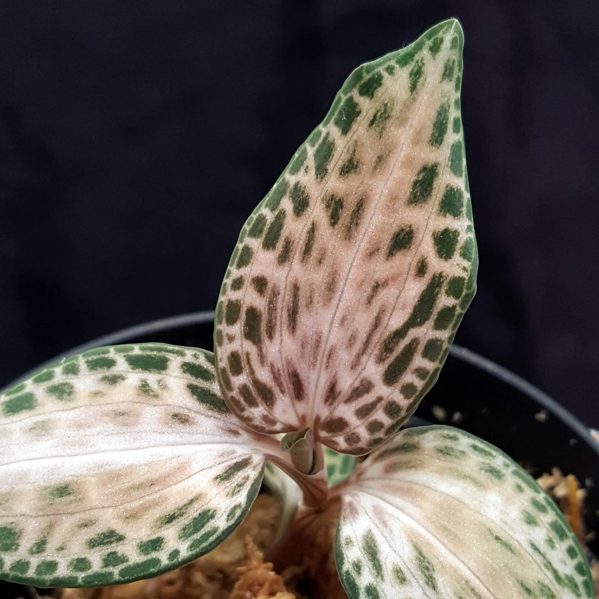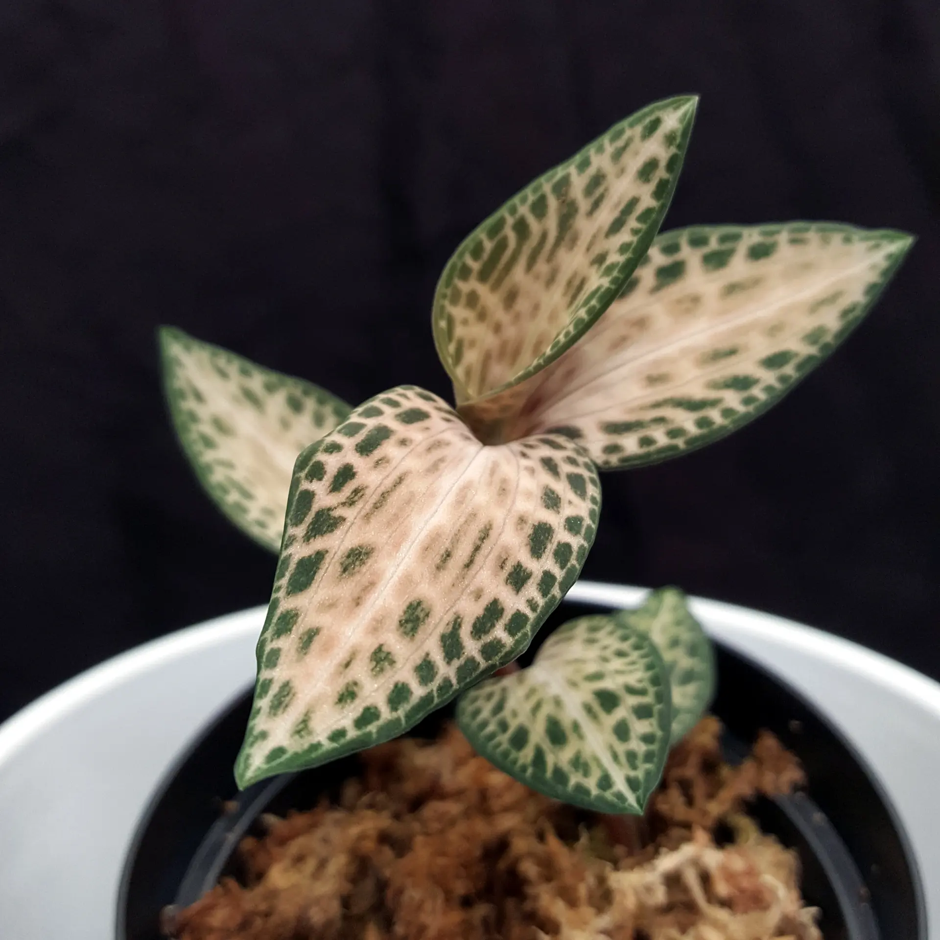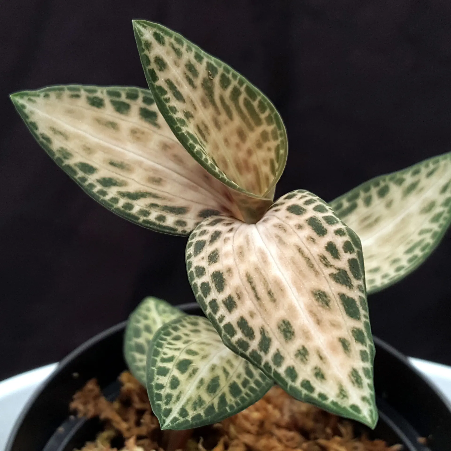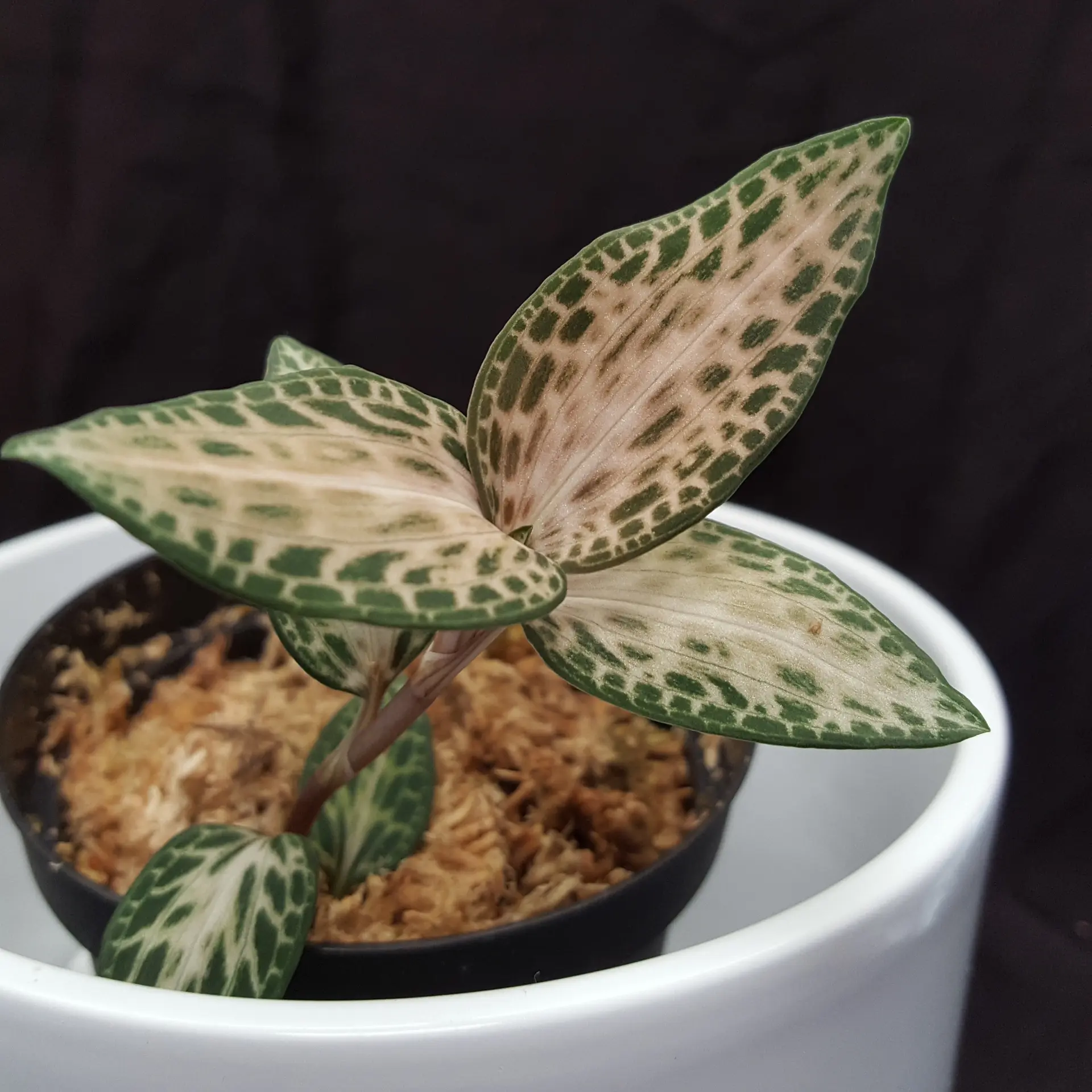 has a wide distribution area in Southeast Asia, so this jewel orchid is correspondingly adaptable. However, it should be kept in a temperate to cool environment - excessively high temperatures do not suit it in the long term. It also likes a loose, moist substrate; waterlogging does not suit it and will lead to the plant's demise. Please avoid direct sunlight, otherwise the few green leaves present will fade. The pictures shown are examples, the plant you purchase is similar to the pictures.